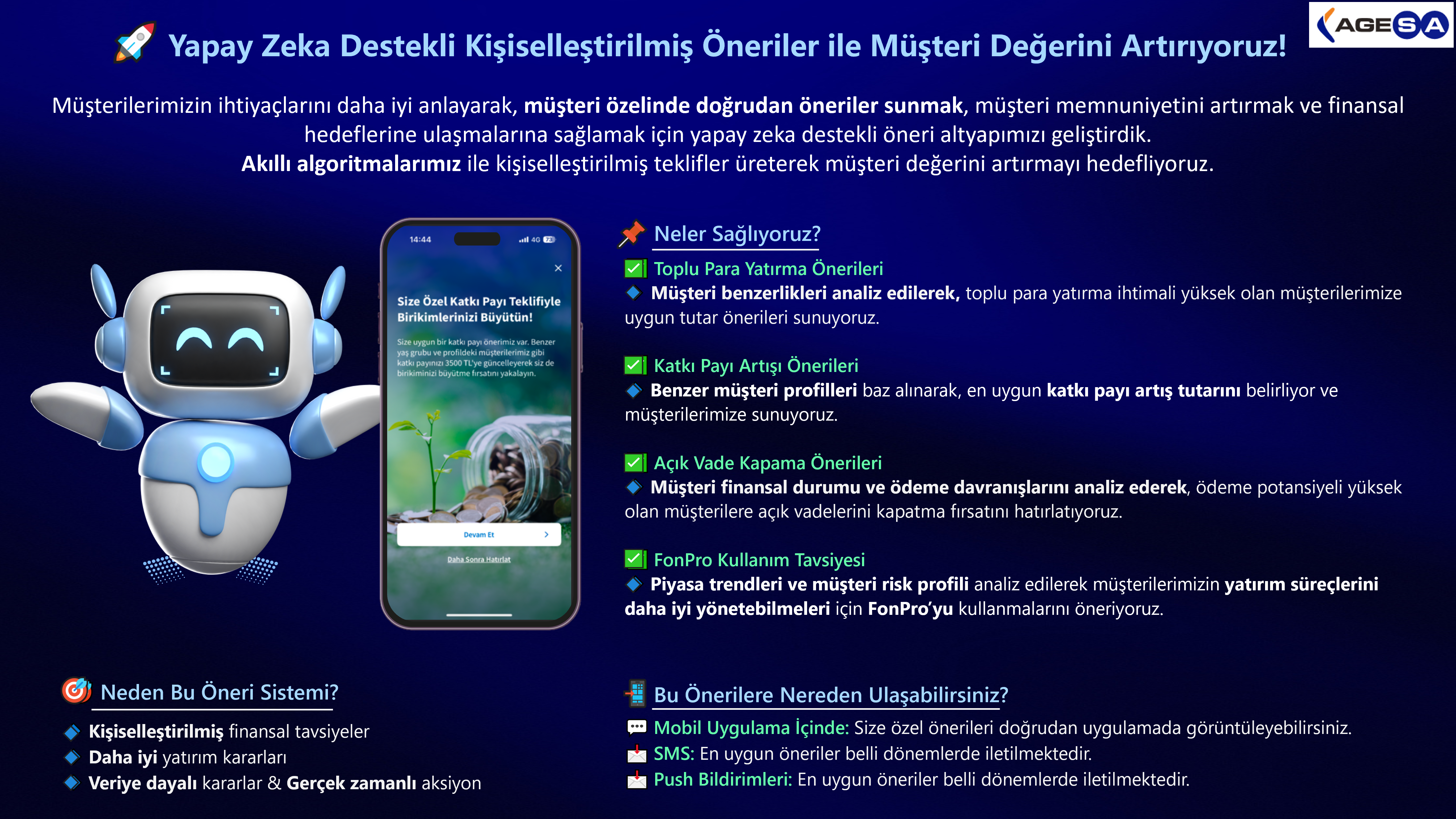 Dijitalleşmenin hızla ilerlediği günümüzde, müşterilerin kişiselleştirilmiş deneyim beklentileri en üst seviyeye ulaşmıştır. Bu ihtiyaca yanıt olarak şirketimiz, sigorta ve bireysel emeklilik sektöründe öncü bir adım atarak mobil uygulama üzerinden yapay zekâ destekli bir öneri motoru geliştirmiştir. Sistem, müşterilere finansal ve finansal olmayan teklifleri anlık ve bağlama uygun şekilde sunarak mobil etkileşimi ve müşteri deneyimini artırmayı hedeflemektedir. Geleneksel statik kampanyaların ötesine geçen proje, dinamik, ölçeklenebilir ve bireye özel karar alma süreçlerini hayata geçirmiştir. Yapay zeka temelli modeller sayesinde müşterilerin finansal geçmişleri, davranışsal eğilimleri ve dijital etkileşimleri derinlemesine analiz edilmiştir. Bu analizleri temel alarak, müşterilerin katkı payı artışı, toplu para yatırımı, açık vade kapama, online BES satışı, FonPro kullanımı gibi aksiyonlara yönlendirilmesini sağlayacak, kişiselleştirilmiş bir öneri sistemi kurulmuştur. On-premise kurulumu sayesinde veri güvenliği ve regülasyon uyumluluğu sağlanmıştır. Lansman ayında %10 dönüşüm oranı ile 150 milyon TL’nin üzerinde finansal katkı elde edilmiş, sistem düşük değer segmentlerinde de etkili sonuçlar üretmiştir. Bu proje, sektörde dijital kanallar üzerinden uçtan uca yapay zekâ destekli ilk öneri sistemi olarak hem gelir artışı hem de müşteri memnuniyeti sağlamıştır.