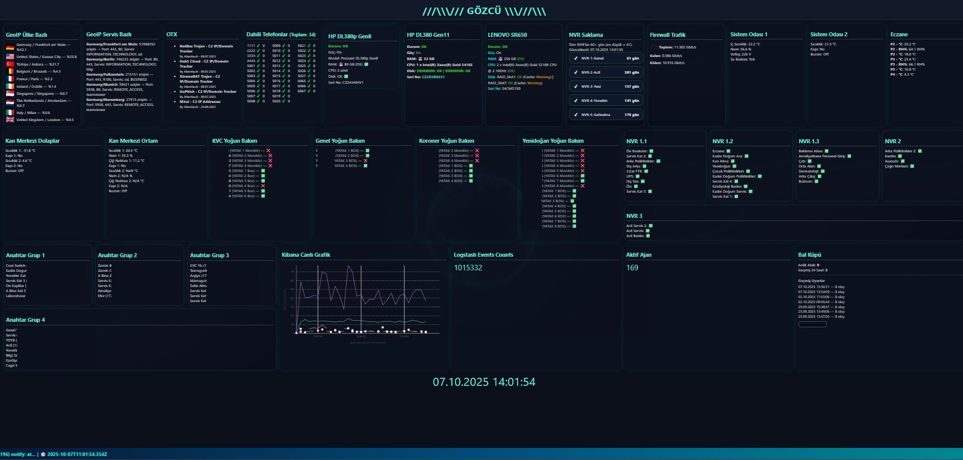 Gözcü; hastane/intranet ortamında çalışan, farklı kaynaklardan (ELK, Wazuh, Zabbix, SNMP, Honeypot’lar, XML/REST uçları vb.) verileri toplayıp tek bir SOC tarzı panelde gösteren, MITRE ATT&CK eşleştirmeleri ve canlı metriklerle desteklenen bir izleme platformudur. Ve halen geliştirilmeye devam etmektedir.